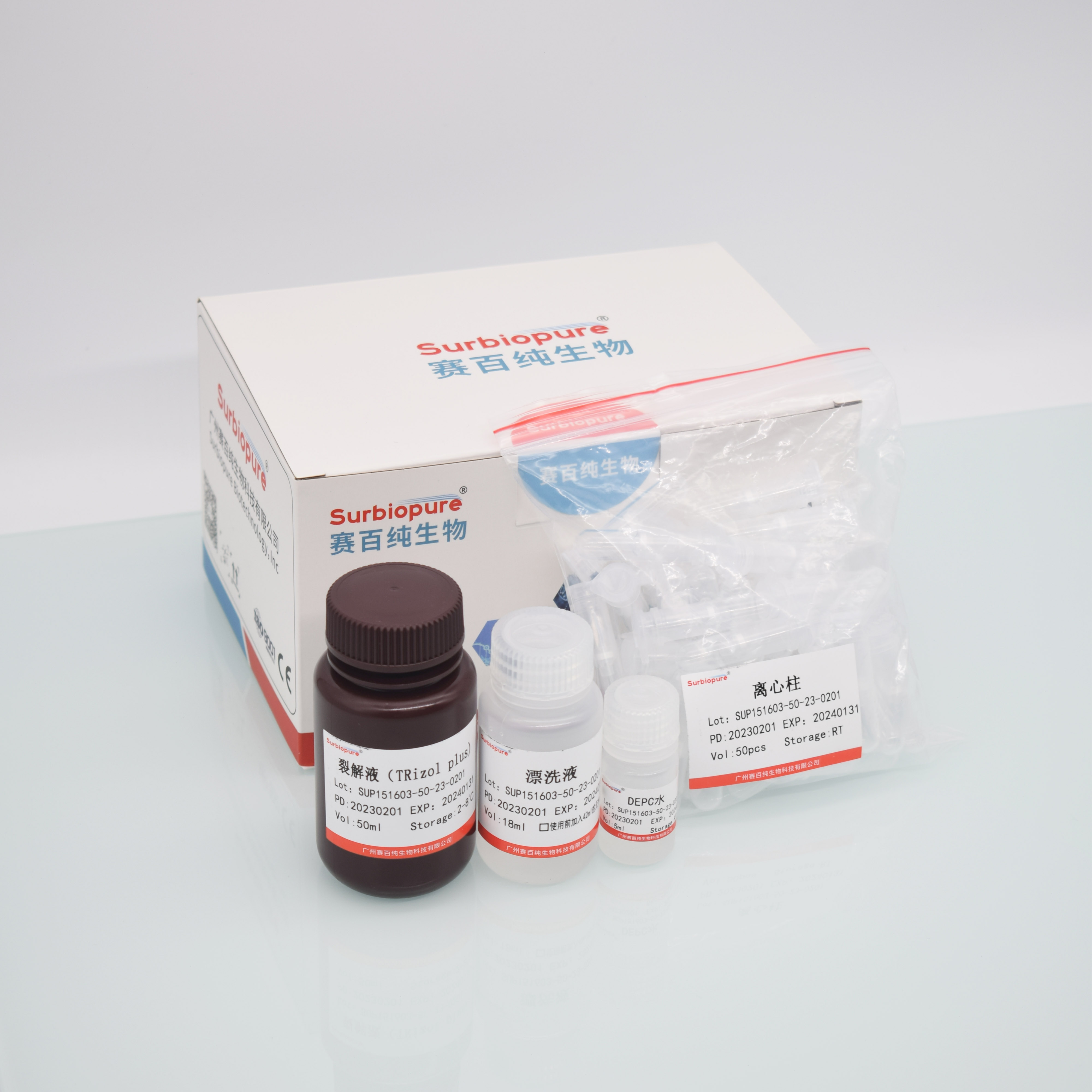 【產(chǎn)品名稱(chēng)】通用型 RNA提取試劑盒 【包裝規(guī)格】Sup-151603:50次、 Sup-151604:100次 【產(chǎn)品簡(jiǎn)介】本試劑盒是基于TRizol改進(jìn)后的柱式總RNA提取試劑盒,裂解液充分裂解并勻質(zhì)化樣本,采用獨(dú)特的硅基質(zhì)膜吸附技術(shù),通過(guò)離心吸附柱在高鹽狀態(tài)下高效專(zhuān)一的結(jié)合溶液中的RNA,同時(shí)最大限度的有效除去蛋白質(zhì)、無(wú)機(jī)鹽離子及有機(jī)雜質(zhì)等;可從動(dòng)物組織、植物材料、各種微生物及培養(yǎng)細(xì)胞等樣品中快速提取總RNA,每次可處理 30-50 mg組織或5×106細(xì)胞,可同時(shí)處理多個(gè)不同樣品。本試劑盒提取得到的RNA可直接應(yīng)用于RT-PCR、Northern Blot、Dot Blot、體外翻譯等實(shí)驗(yàn)。 【產(chǎn)品特點(diǎn)】 ·純度高:最大限度除去蛋白質(zhì)等雜質(zhì),提取的RNA可直接用于下游各種實(shí)驗(yàn)。 ·提取量大:獨(dú)特的裂解液配方,充分裂解細(xì)胞或組織,RNA提取量多至100 μg。 ·快速:步驟少,操作簡(jiǎn)單,節(jié)省時(shí)間。 ·兼容性強(qiáng):適用于多種動(dòng)植物組織和細(xì)胞RNA的提取。151603 151604